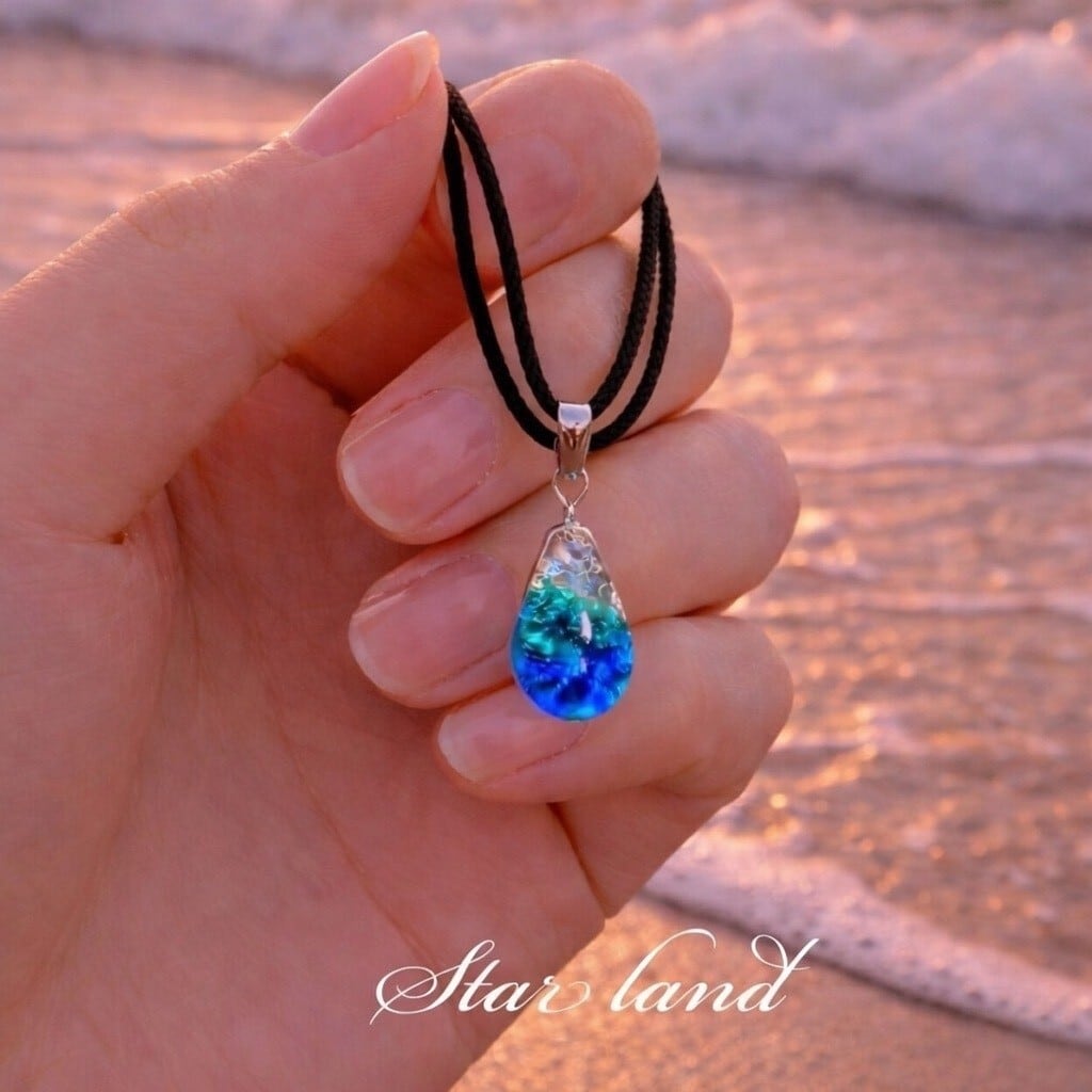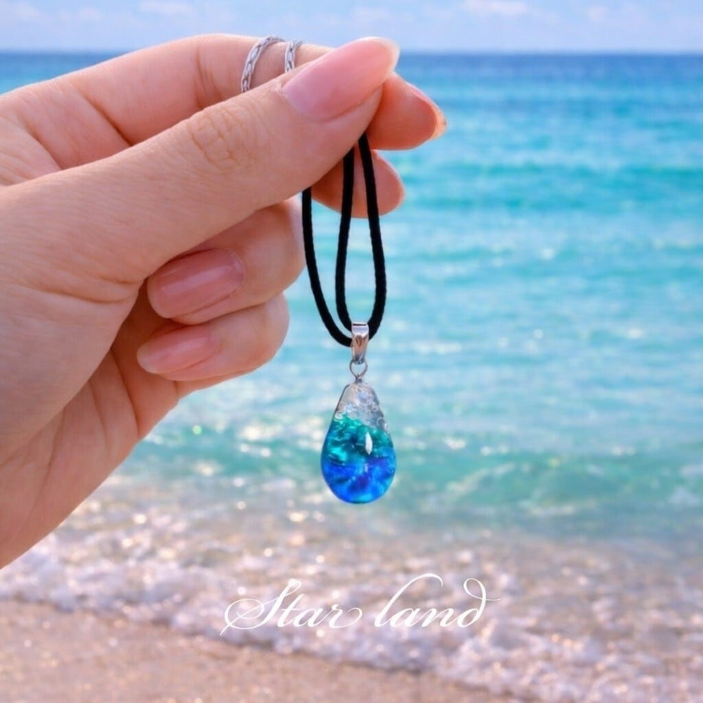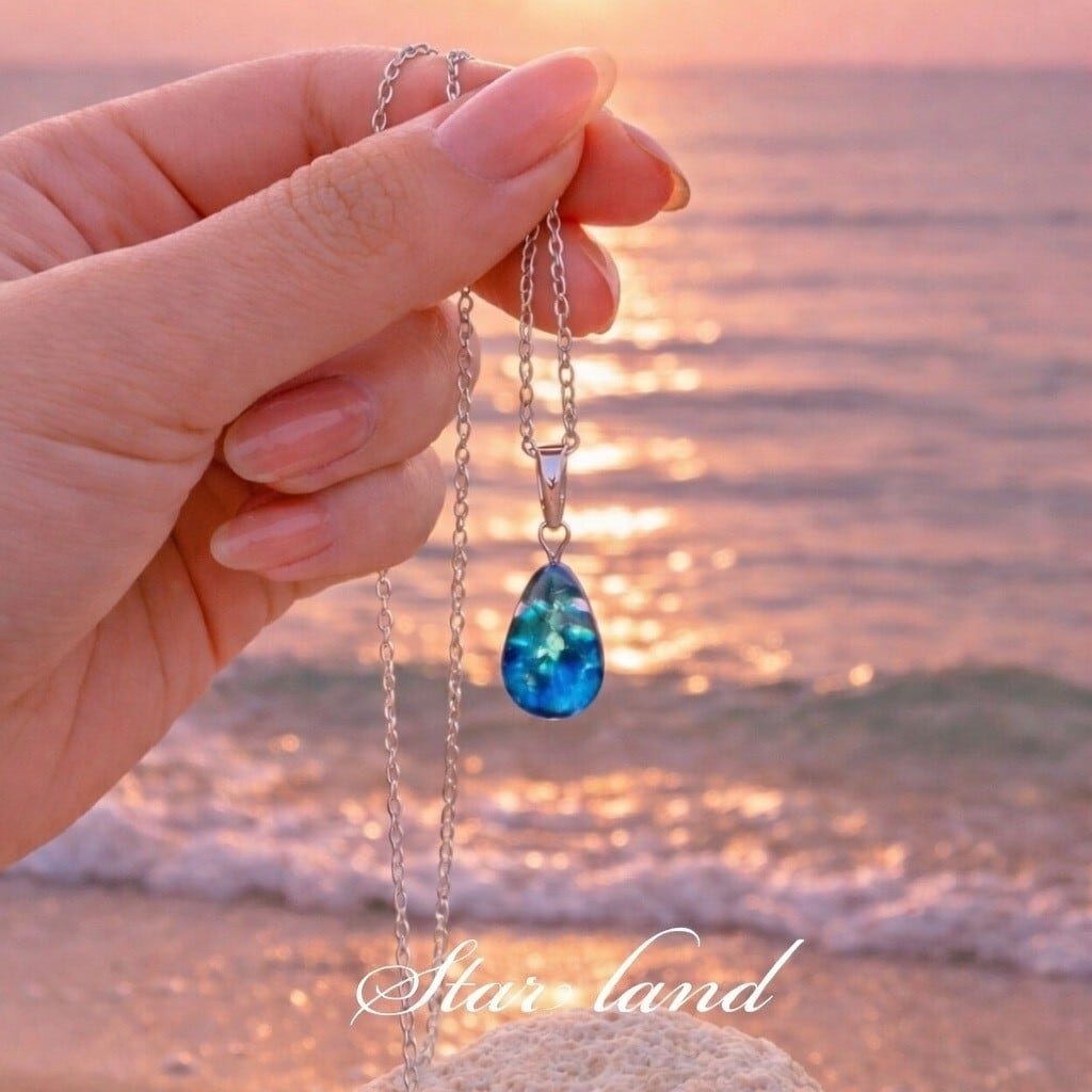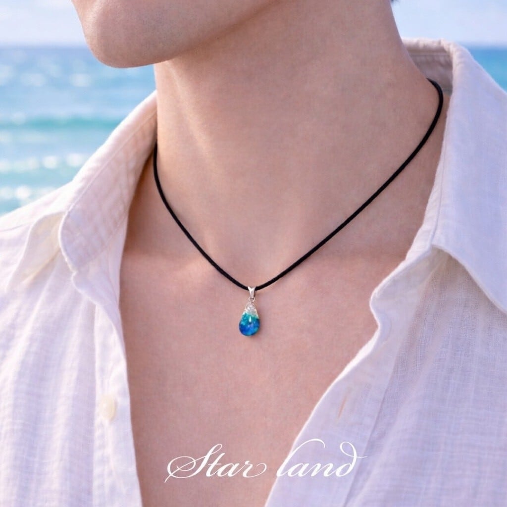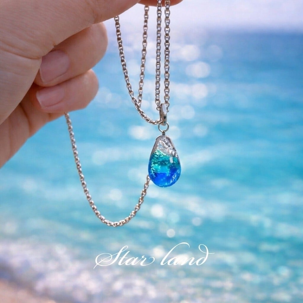 沖縄の海と輝きを閉じ込めたホタルガラスを使用した上品なネックレス。